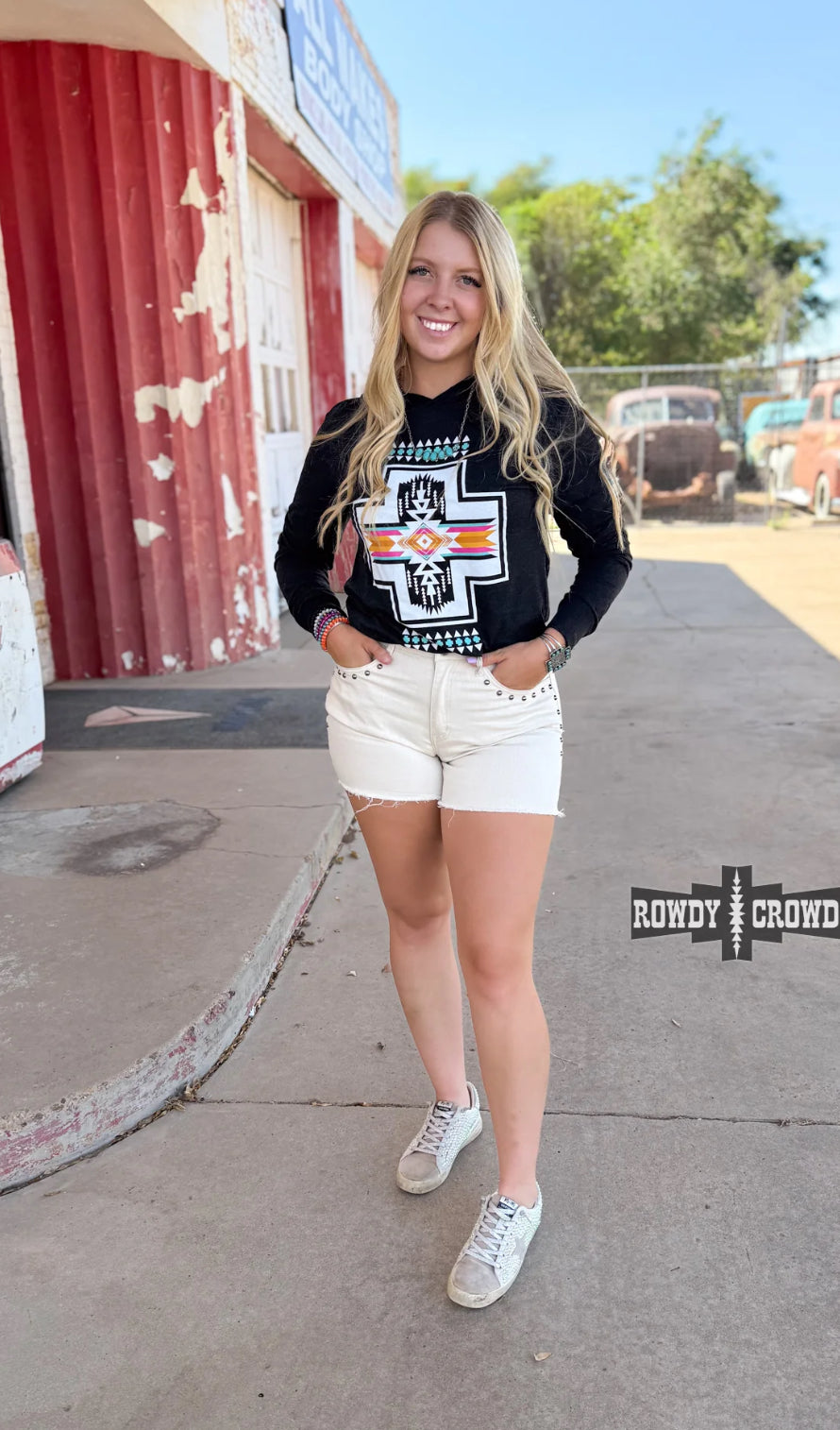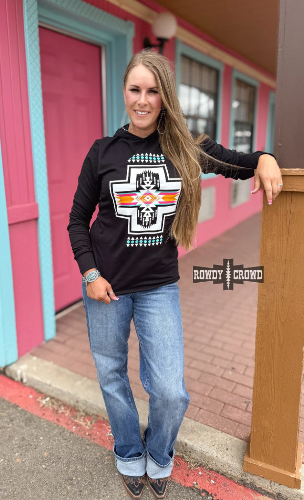 If you love a dark shirt with pops of color then the Angel Fire Hoodie is for you! With vibrant colors and aztec print, this southwest-inspired hoodie screams bold. Stay cozy in any season with this must-have piece.
