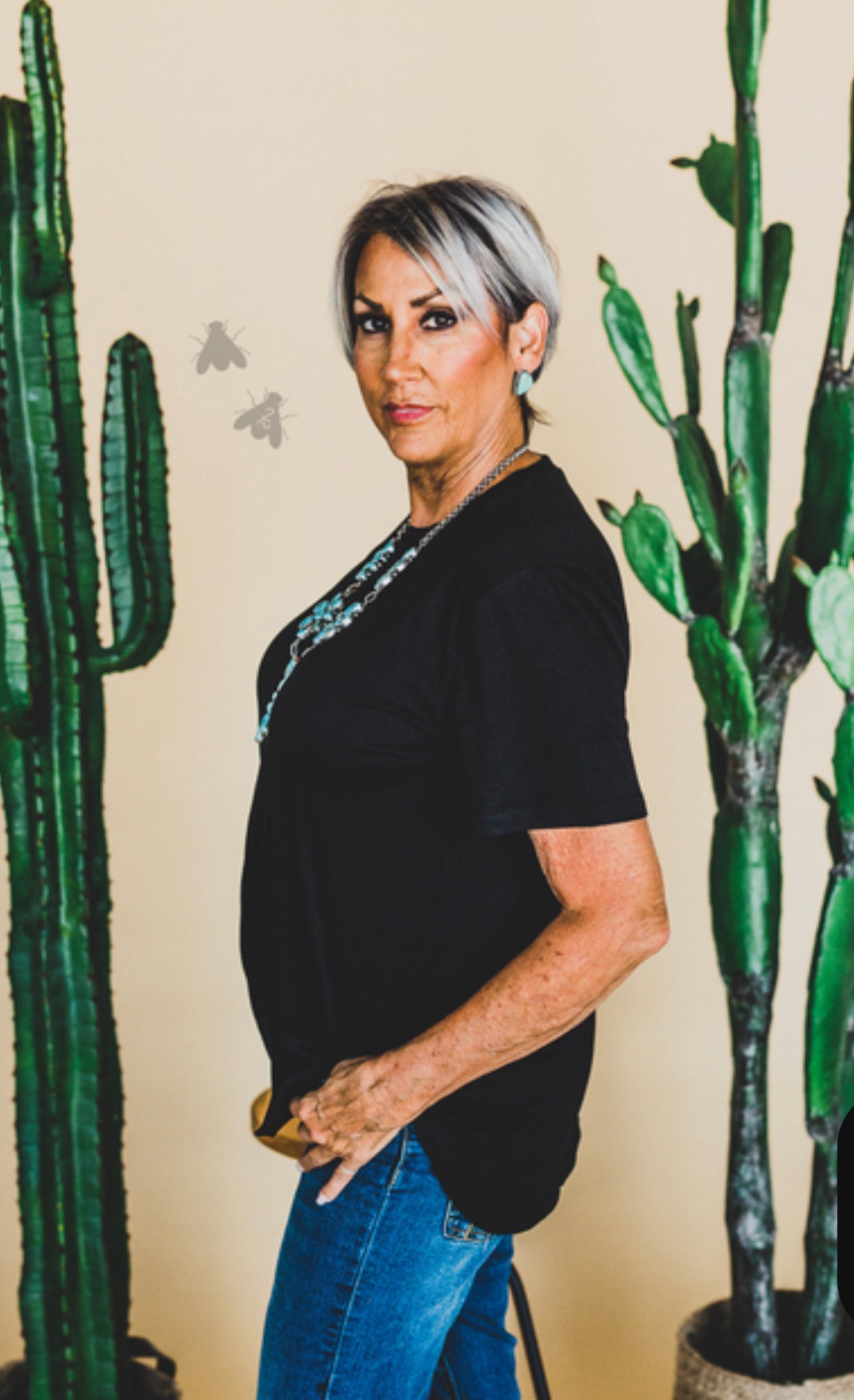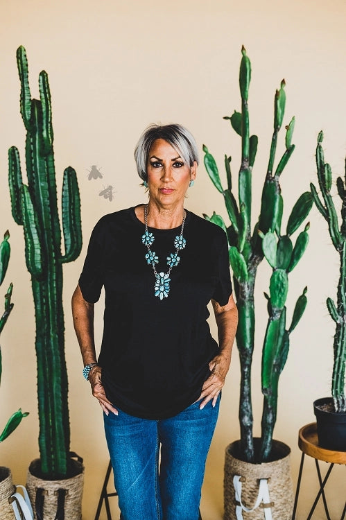 Perfect layering shirt for all seasons. Dress it up with a squash blossom or some of our layering beaded necklaces.