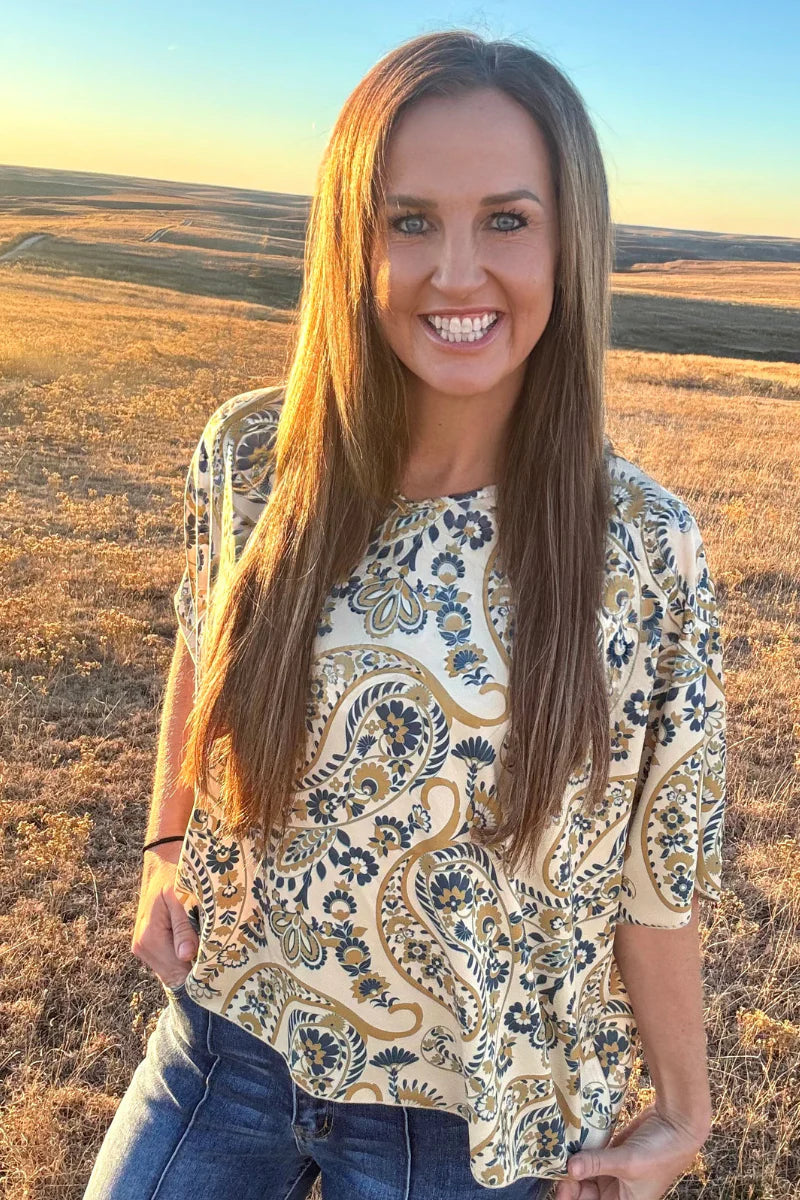 Meet the Cactus Kreek Top—your new favorite way to add a splash of whimsy to your closet! This cream-colored beauty features a stunning paisley design in jewel tones of green, turquoise, and mustard that'll have you turning heads. Perfect for mixing and matching with your everyday essentials, this playful piece brings just the right amount of personality without trying too hard. Comfort meets style in the most delightful way.
