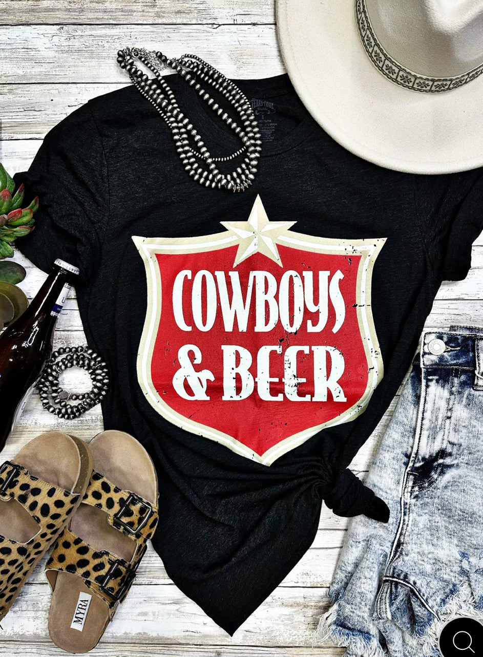 Bold, bright red is a statement on this fun tee. Great for a gal that's a fan of cowboys and a cold beer!