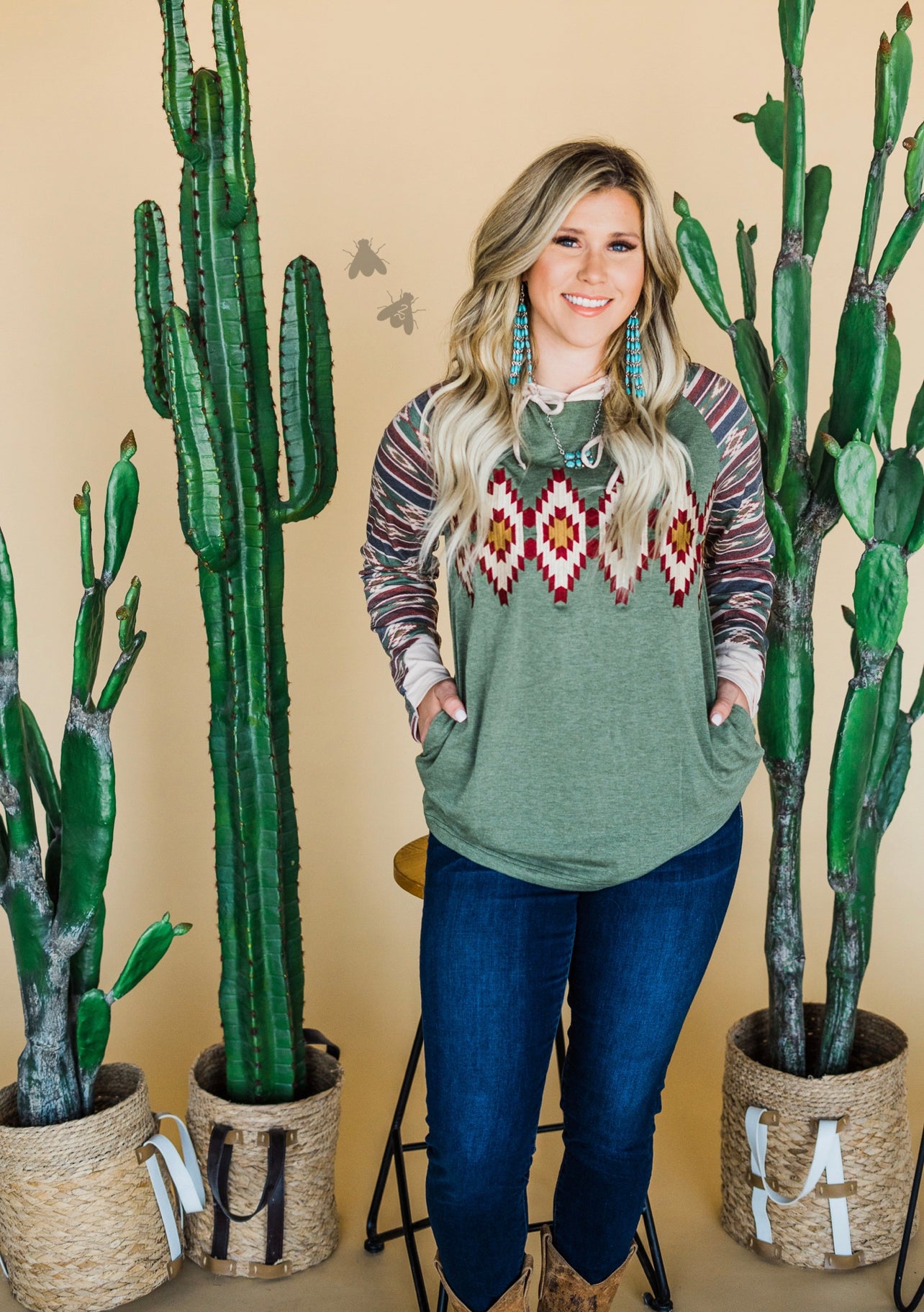 This pullover hoodie with Aztec sleeves is a beautiful transition piece into fall and winter! I love the embroidery on the chest. It sets it apart from the rest. I wear a size small my true to size.
