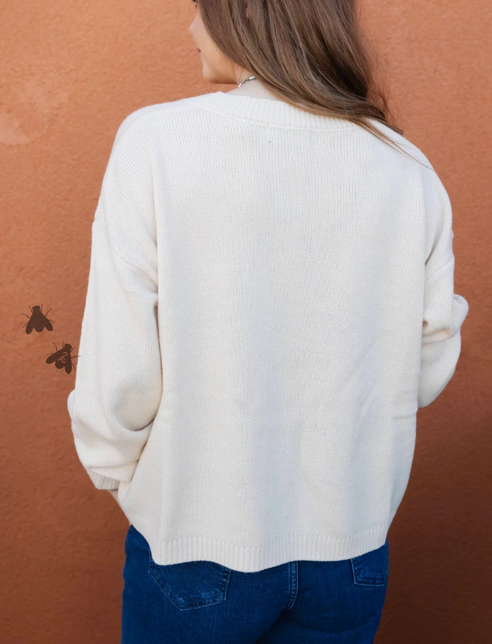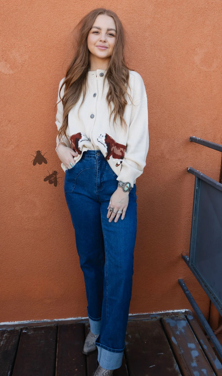 cream beige cardigan with some rad hereford patches... we are in LOVEEE.