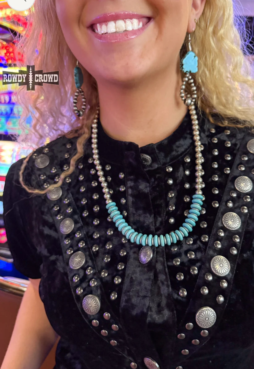 The Mesquite Necklace blends bold turquoise vibes with classic western silver for a look that never misses. Chunky turquoise disc beads are framed by smooth silver pearls, creating the perfect balance of statement and staple. It’s eye-catching, versatile, and designed to elevate everything from graphic tees to your dressiest rodeo fit.