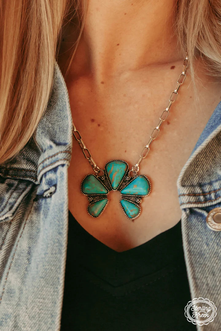 "Turn heads with the Sagebrush Creek Necklace! This silver paper clip necklace boasts 5 stunning turquoise stones that will add a pop of color to any outfit. Upgrade your accessory game with this unique and playful piece. (Note: not your average paper clip!)"