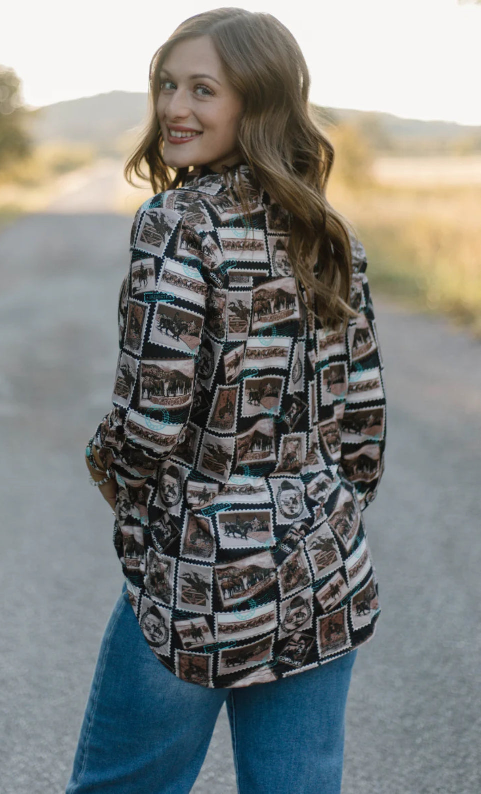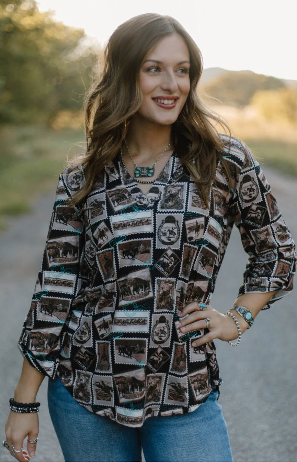 The Western Press Top combines quarter sleeves with authentic vintage western stamps, enhanced by a vibrant pop of turquoise for a fresh, eye-catching look. This top seamlessly blends timeless western flair with modern style, offering both comfort and distinctive character perfect for your everyday wardrobe.